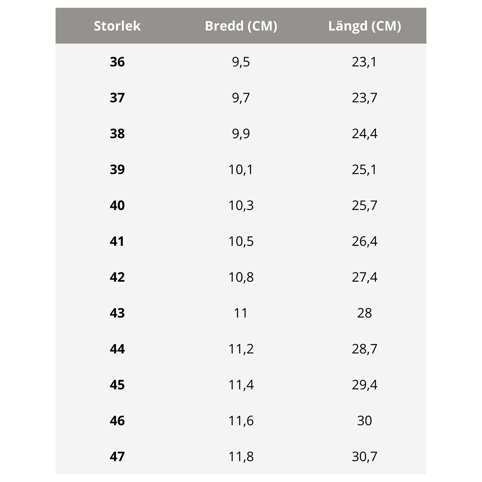 Størrelsesskemaet viser skoenes indvendige længde og bredde i centimeter.