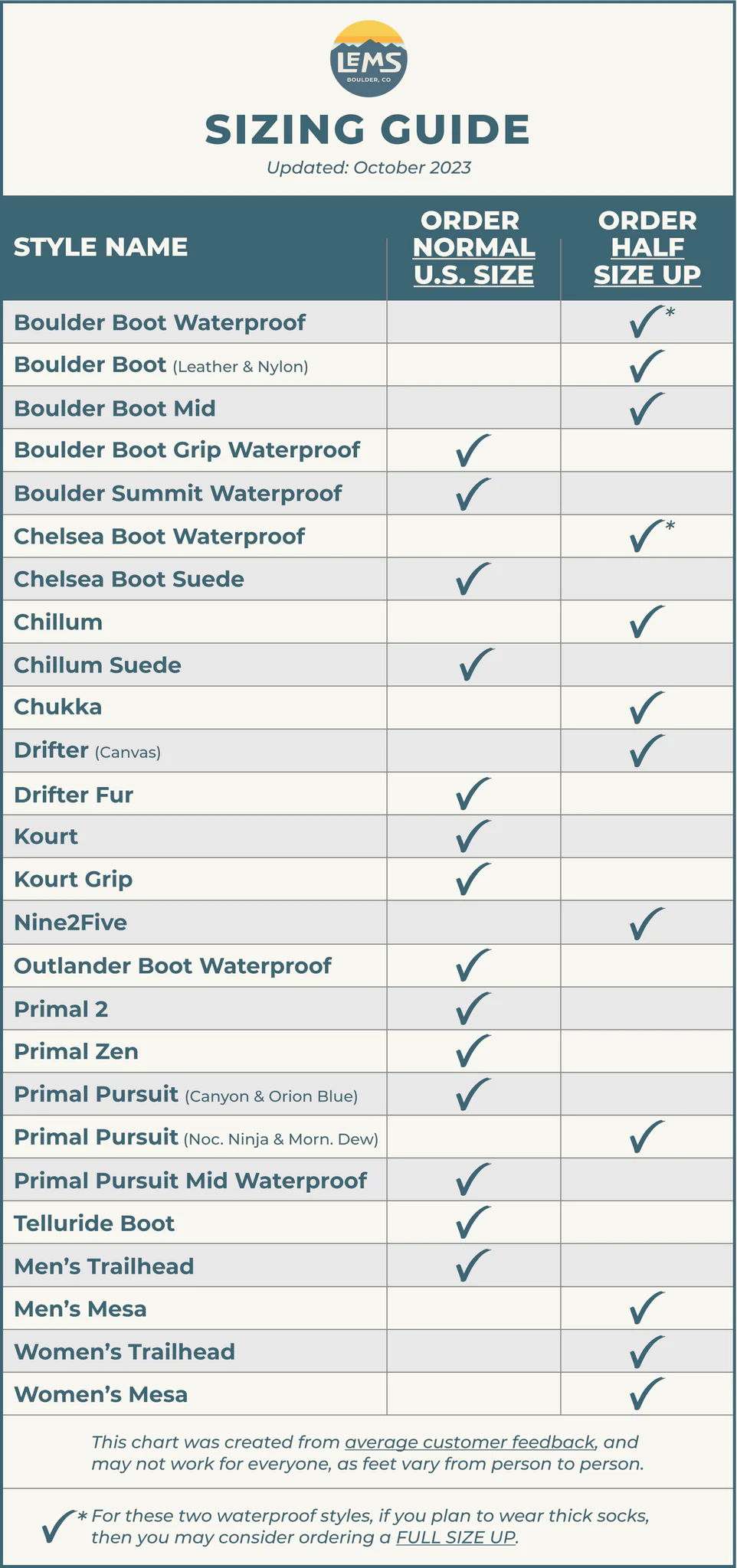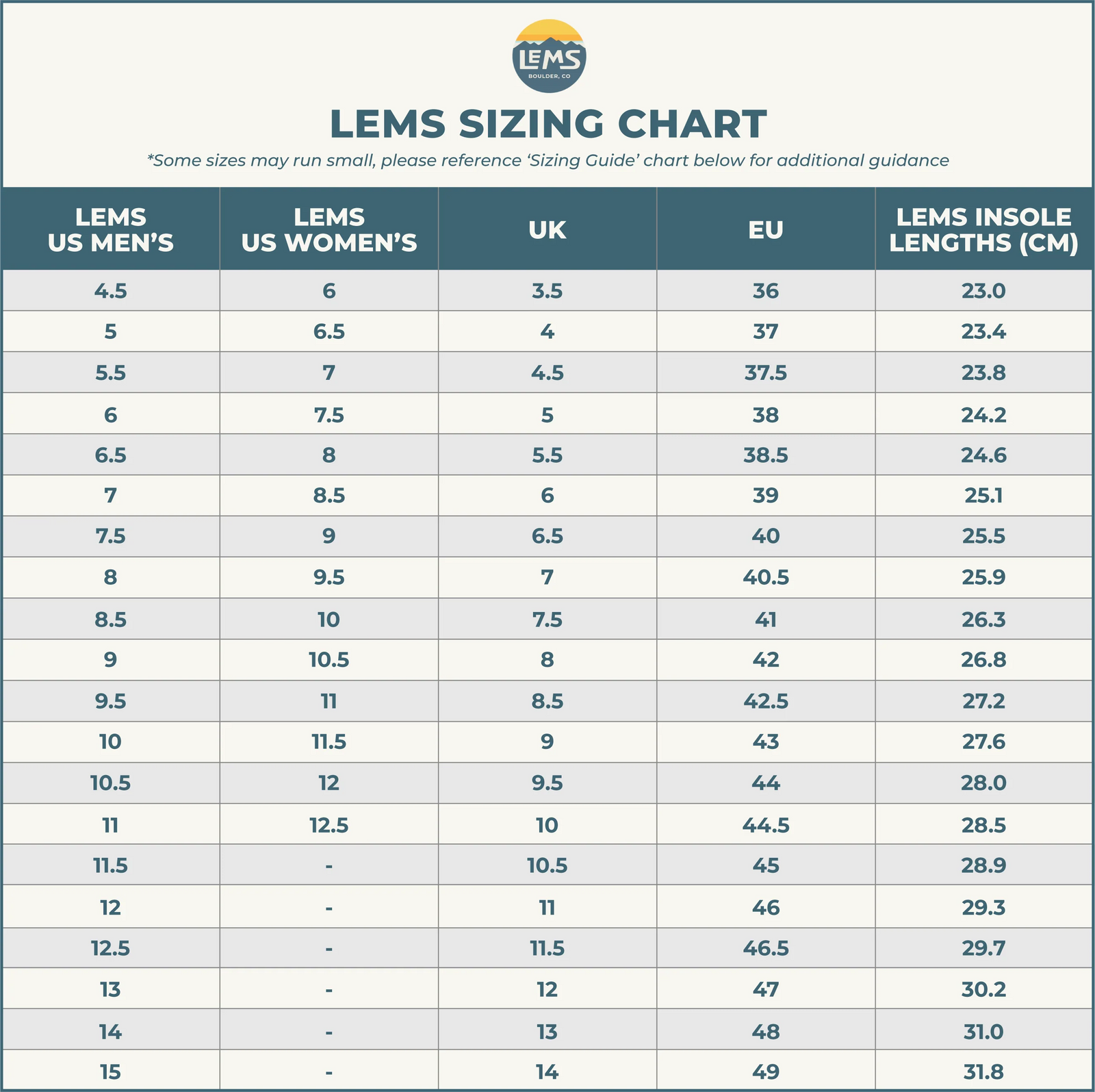 Bemærk venligst, at denne tabel kun viser den indvendige størrelse på skoene fra Lems.