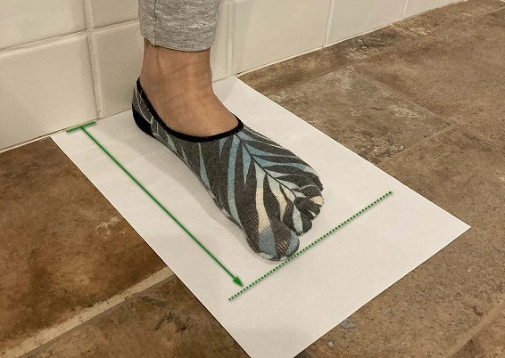 Tegn en linje for at markere enden af den længste del af foden, dvs. den længste tå. Mål afstanden. afstanden mellem papirets kant og det markerede punkt. På denne måde får du længden af din fod. Gentag trinnene med den anden fod.