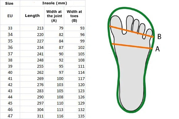 Læg 0,5-1,2 cm til din fods samlede længde for at give plads til dine tæer. Sammenlign disse mål med længden af vores indersål, og vælg den perfekte størrelse. Hvis du er mellem to størrelser, anbefaler vi at vælge den største.