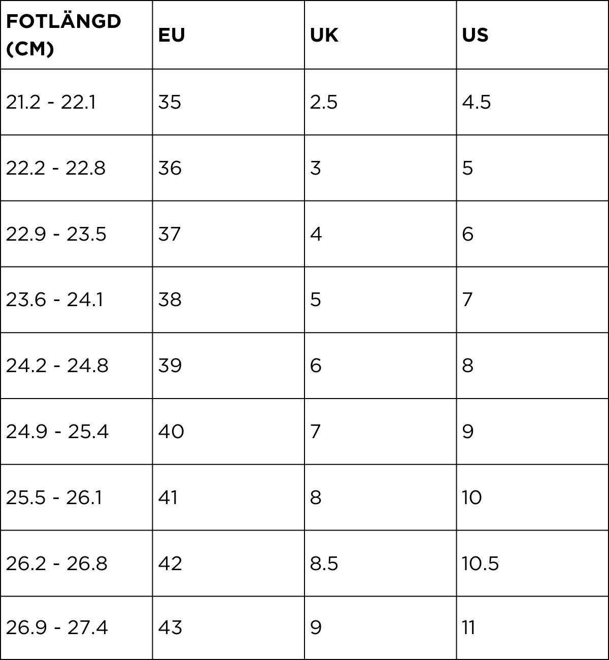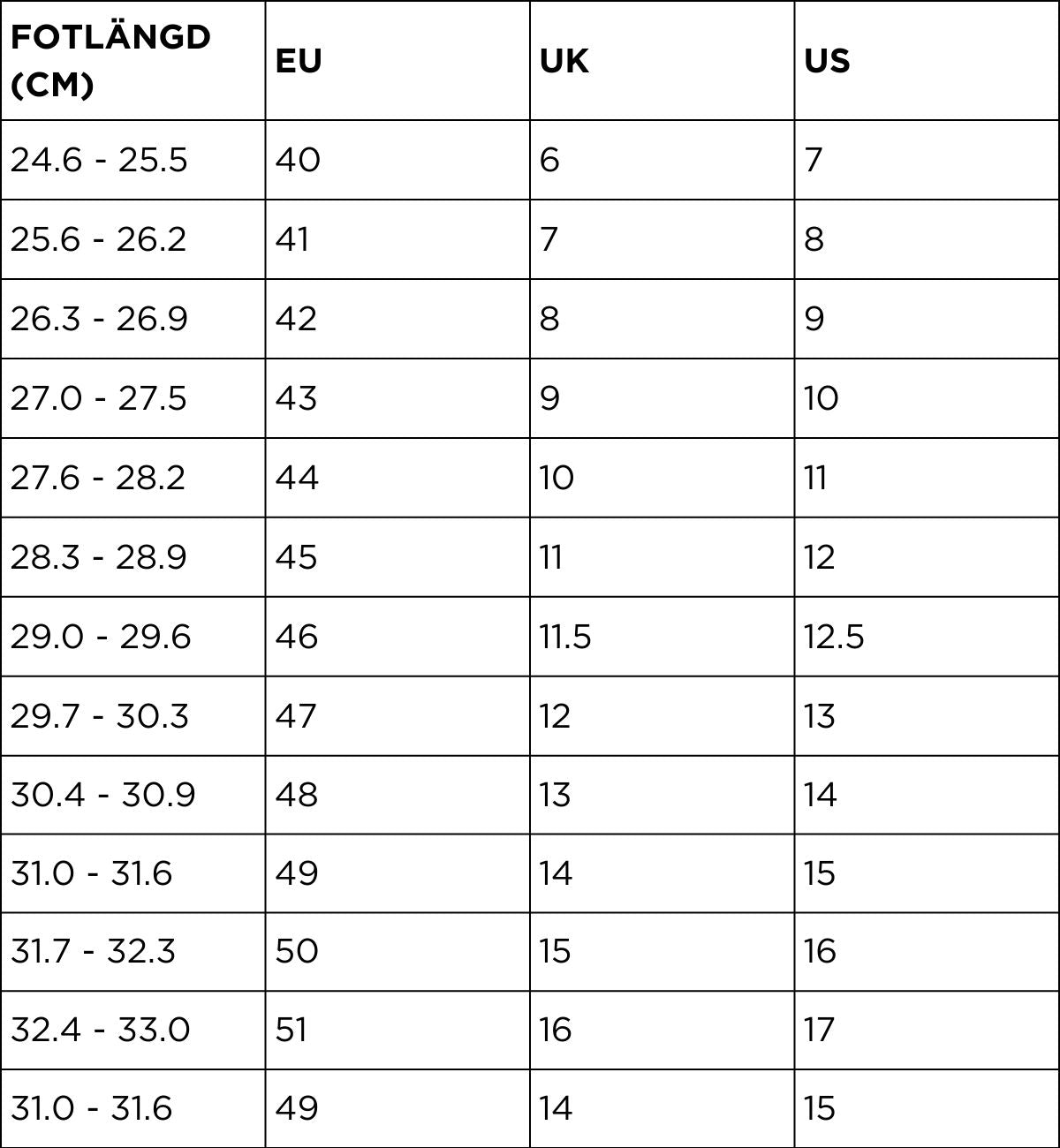 Brug vores konverteringstabel nedenfor til at beregne din anbefalede pasform.